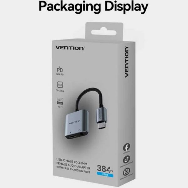 Adaptador Audio Vention BIGHA/ USB Tipo-C Macho – Jack 3.5 Hembra/ USB Tipo-C PD Hembra/ Gris