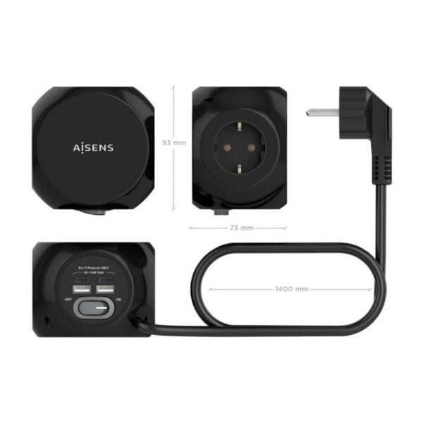 Regleta con Interruptor Aisens ASPS-2A2C11-BK/ 3 Tomas de Corriente/ 2 USB – 2 USB Tipo-C/ Cable 1.4m/ Negro