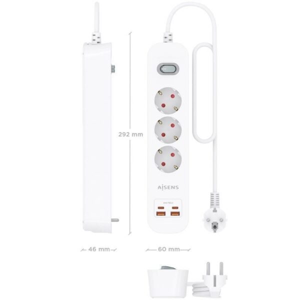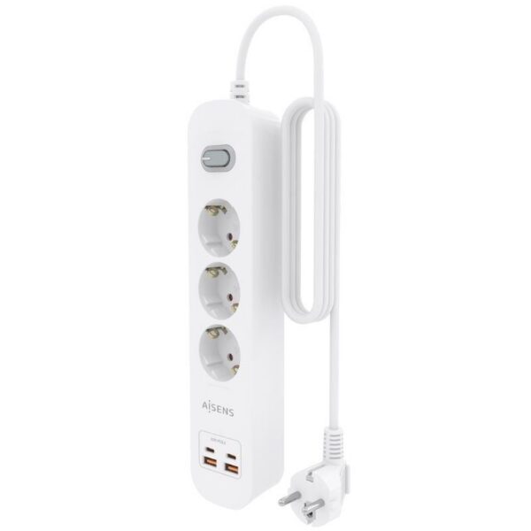Regleta con Interruptor Aisens ASPS-2A2C10-W/ 3 Tomas de Corriente/ 2 USB – 2 USB Tipo-C/ Cable 1.4m/ Blanco