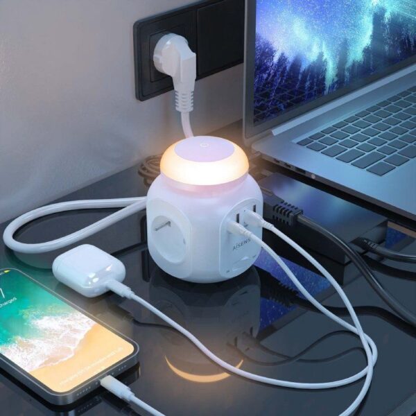 Regleta con Interruptor y Luz Nocturna Aisens ASPS-3A1CL01-W/ 4 Tomas de Corriente/ 1 USB Tipo-C/ 3 USB/ Cable 1.8m/ Blanco
