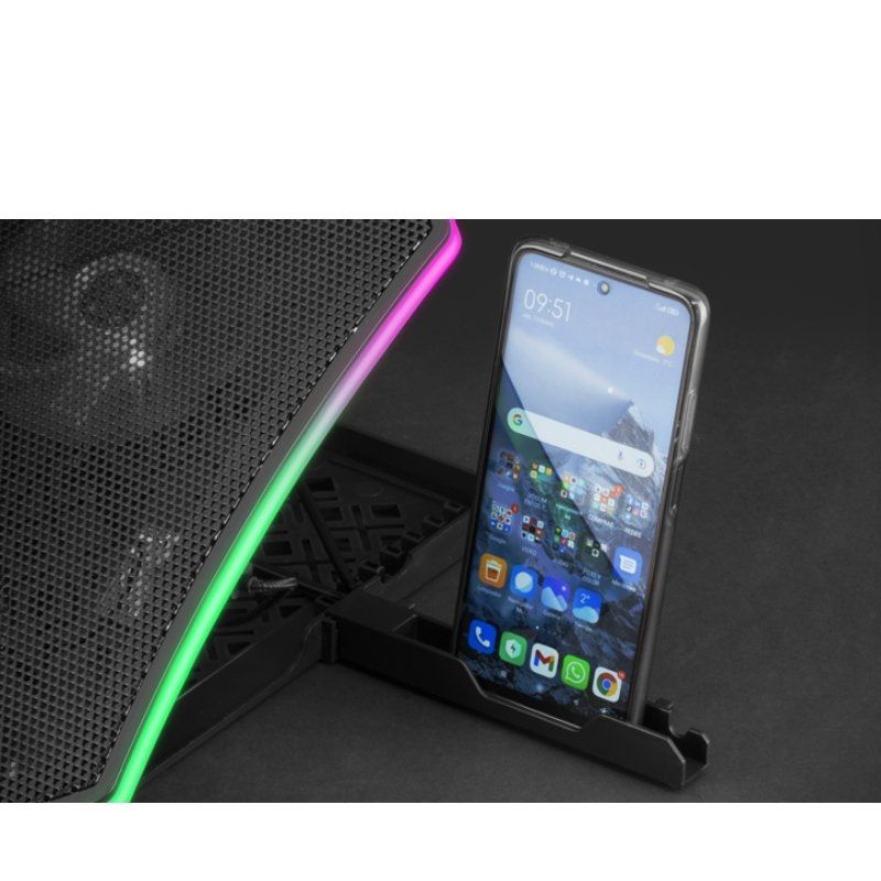 ‘Base de refrigeración y soporte premium para portátiles avanzados. Todo ‘lo que puedas desear al alcance de tu mano: espectacular iluminación ‘ARGB dinámica controlable, gran tamaño XL para soportar los portátiles ‘más potentes, refrigeración extrema con 3 grandes ventiladores ‘controlados digitalmente, función stand con 7 posiciones seleccionables y’ un stand exclusivo para tu smartphone.