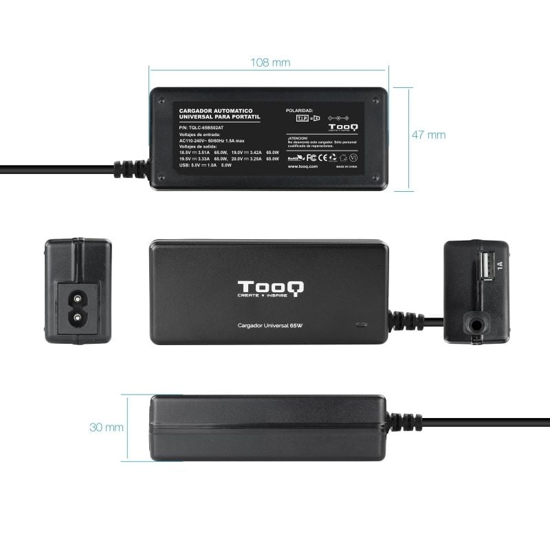 Cargador de Portátil TooQ TQLC-65BS02AT/ 65W/ 1xUSB/ Automático/ 8 Conectores/ Voltaje 18.5-20V/ 1 USB