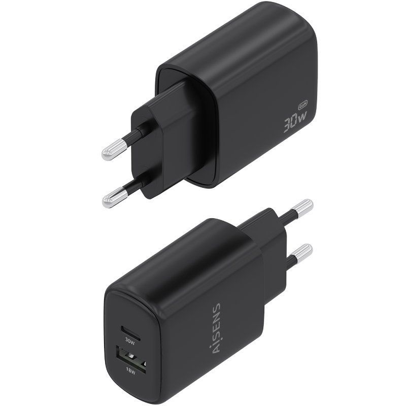 AISENS – CARGADOR GaN 30W, 1xUSB-C PD3.0 QC4.0, 1xUSB-A QC3.0, NEGRO