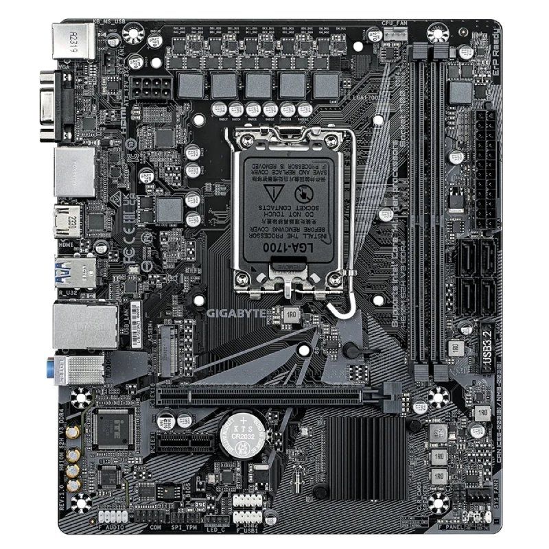 Placa base gigabyte h610m s2h v3 ddr4 socket 1700/ ddr4/ pcie 4.0/ micro atx Chipset:H610;Factor de Forma:Micro ATX;InterFace de Disco M.2:1 Ranuras M.2;Procesador:Para Intel;RAM Máxima:64 GB RAM;Socket Compatible:1700;Tipo de Memoria:Memoria DDR4;Zocalos RAM:2 zocalos;