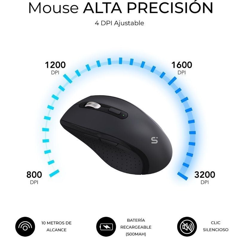 - Ratón Ergonómico y Preciso. Diseño para uso diestro, con clic silencioso y botones laterales de Avanzar/Retroceder. Ajusta su sensibilidad entre 800/1200/1600/3200 DPI para mayor precisión.